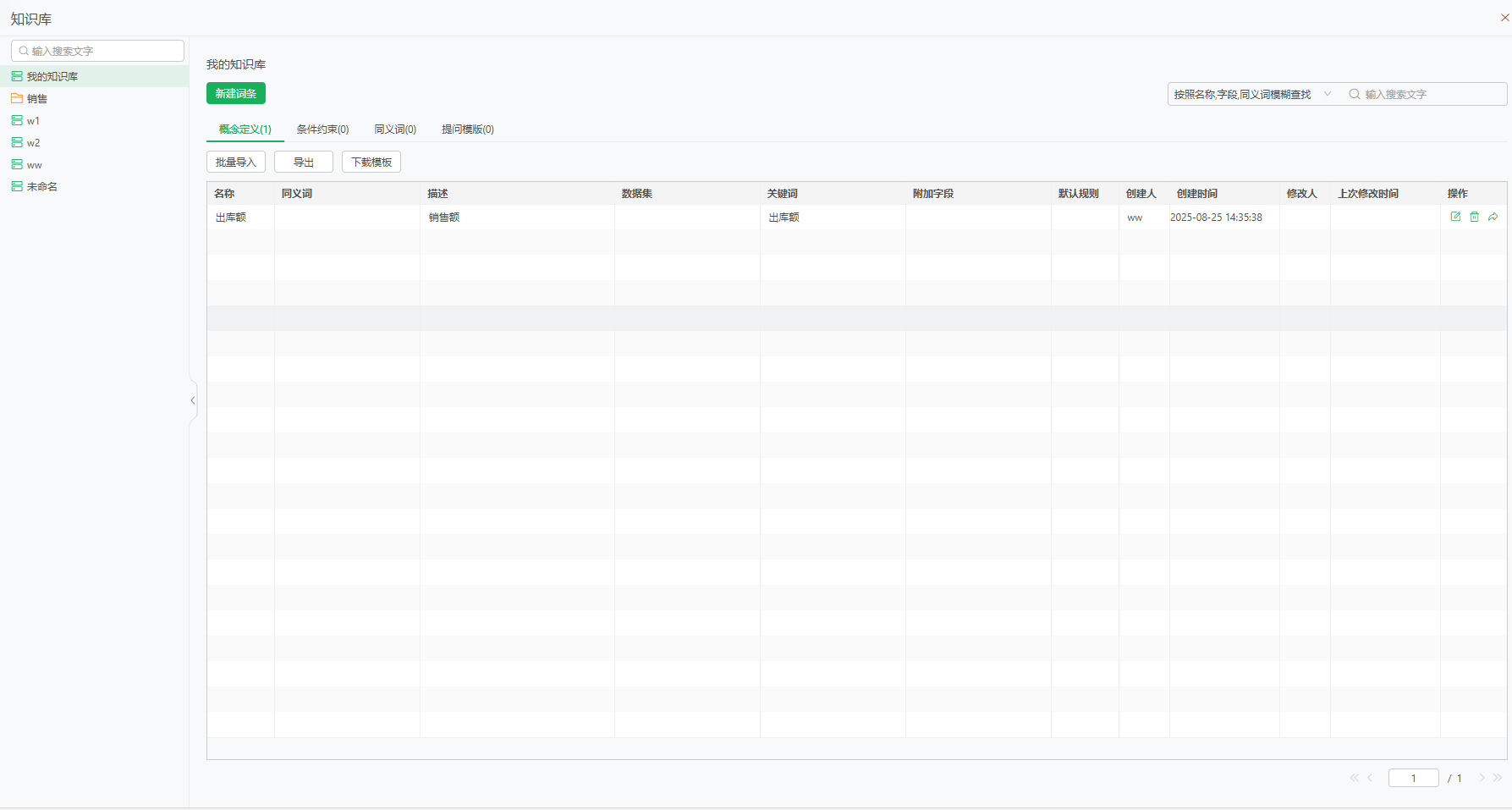 知识库管理页面,支持新建四种类型的词条,包括概念定义、条件约束、同义词、提问模板,其中提问模板支持维度字段、度量字段、字段值、时间,还支持用户自定义变量,包括数值和文本类型变量。