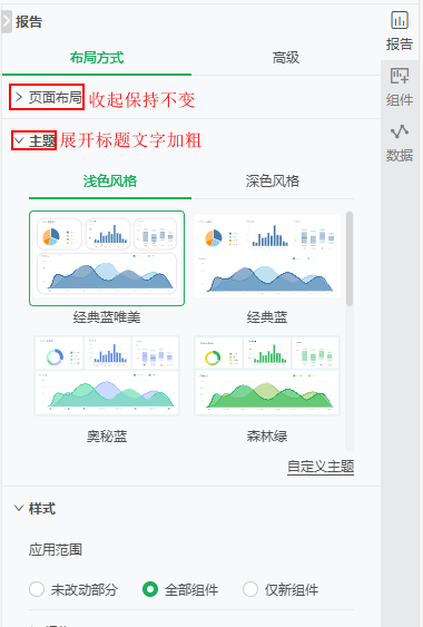 •报告:新建分析报告、新建大屏报告、新建即席分析右侧pane(报告、数据、格式、设置、图形、轴),将前面有展开收起图标的一级标题展开后加粗,收起时还保持不加粗的效果。