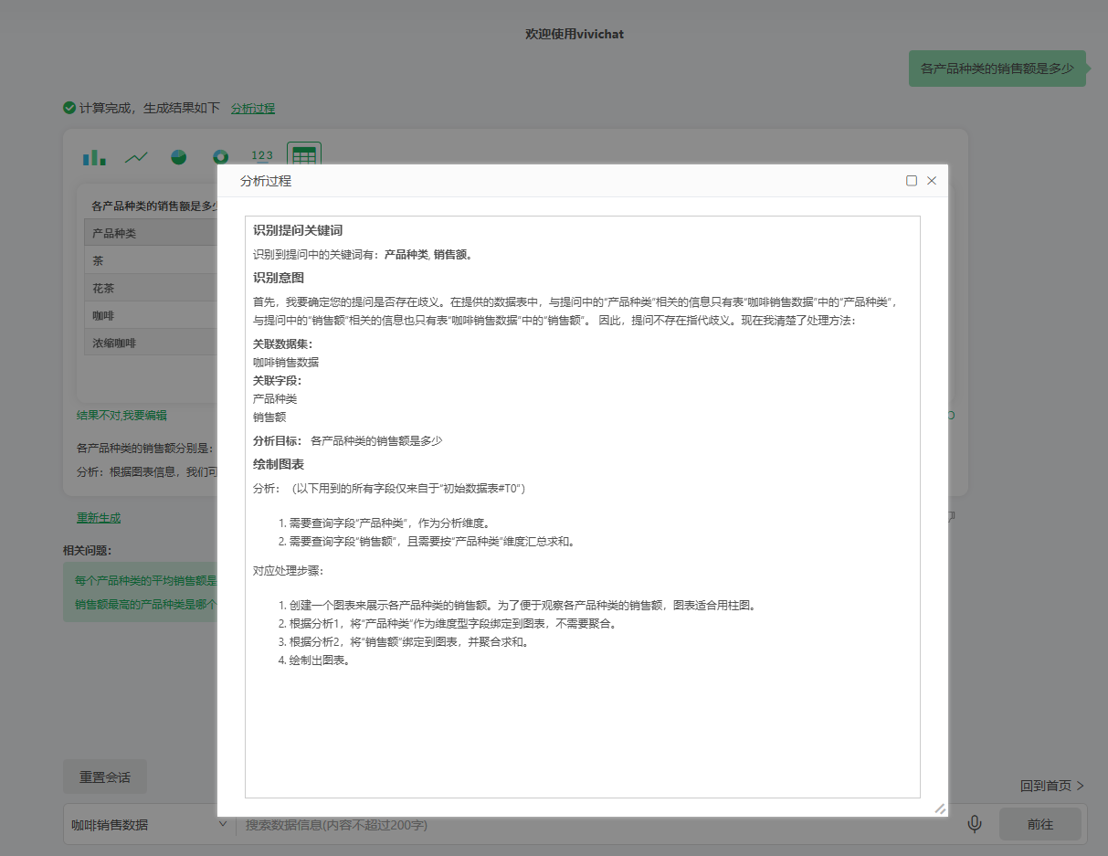 按上下键/鼠标点击提示直接填充到输入框中,替换匹配的字符。比如输入了“各产品”,选择了“产品种类”,则“产品”替换为“产品种类”,输入框里显示”各产品种类“,用户继续编辑。按回车或点击前往按钮,系统开始分析提问。