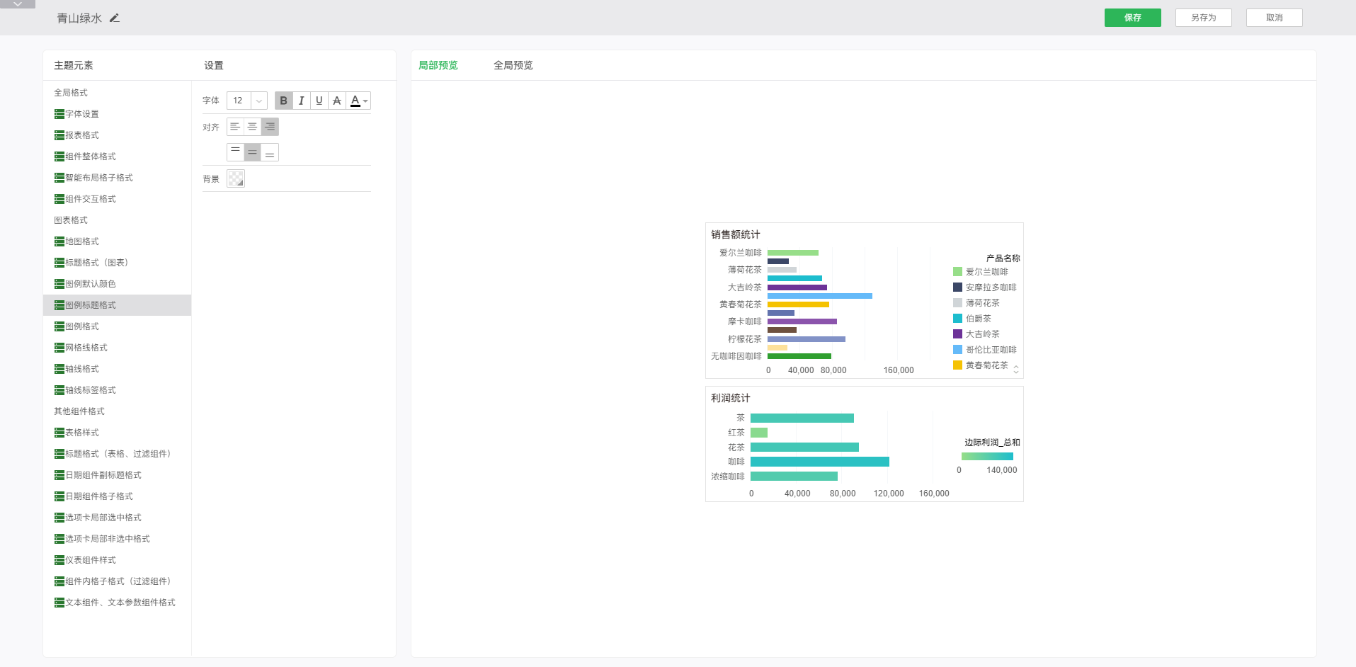 3.在左侧主题元素列表中选择需要设置的元素,即设置该元素的样式,并预览样式效果。默认状态下,只显示正在设置的组件的预览效果。点击预览区上方的“全局预览”按钮,可查看仪表盘的整体效果。