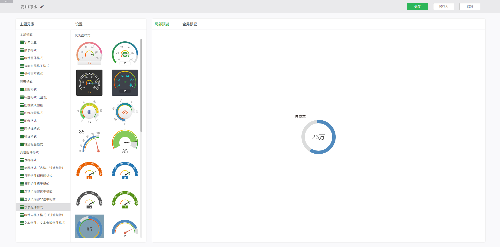 仪表组件样式设置主题仪表盘的默认样式,设置完成后可在右侧预览区进行全局预览和局部预览查看。