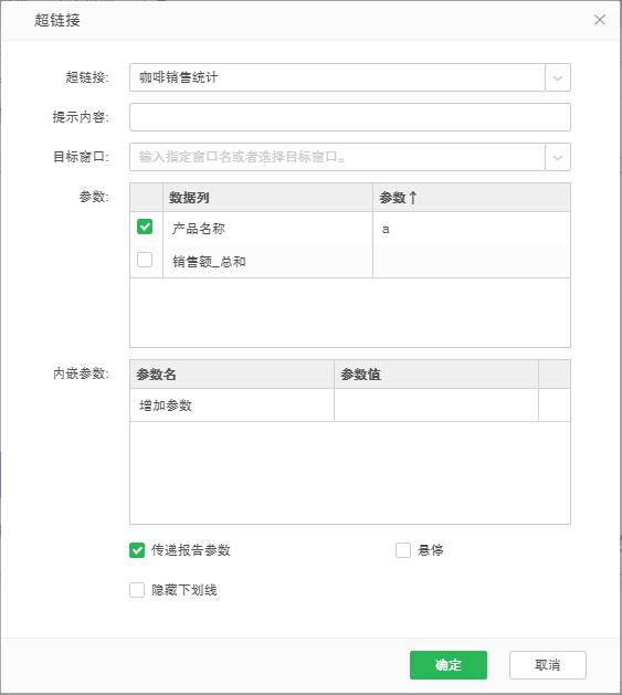2)设置超链接信息,链接到仪表盘“咖啡销售统计”上,并且传递“产品名称”列到“咖啡销售统计”仪表板的过滤器中。