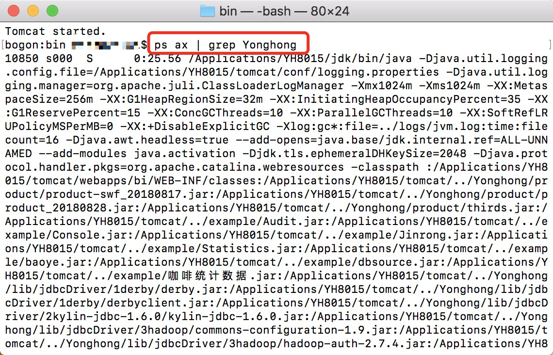 5、输入命令:ps ax | grepYonghong 检查进程是否正常启动: