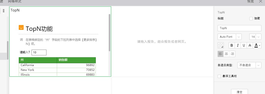 可以拖拽仪表盘,门户组件,网页到网格组件的网格内。从左侧的报告 / 典型功能演示 中拖拽TopN到网格组合内,如图所示: