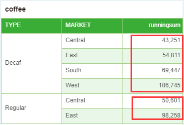 当用户需要统计每种类型下各市场的总利润累计时,可调用 runningSum() 函数,脚本语句为 runningSum(Sum(col['PROFIT']),col['TYPE']); 如下图所示。