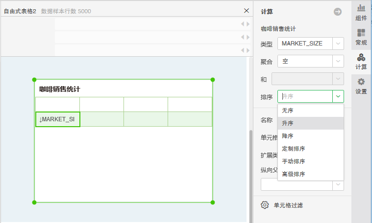 直接绑定数据列的单元格命名规则为:‘数据集名称:列名’或者‘数据集名称:列名_聚合类型’(例如:咖啡销售统计:MARKET;咖啡销售统计:SALES_总和)