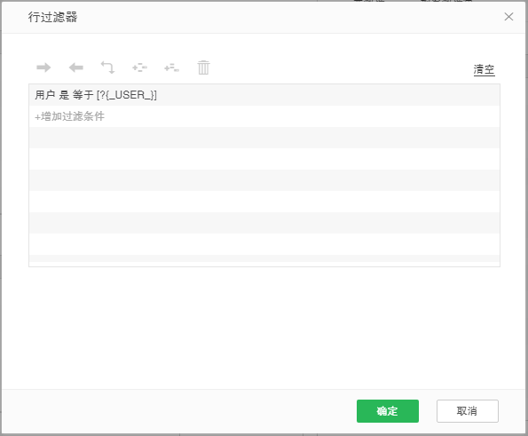 2. 编辑行过滤器,在弹出框中设置行过滤器:用户 是 等于 [?{_USER_}],保存数据集。如下图所示: