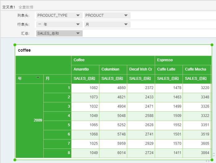 年初至今增长率就是今年第 n 月与第 n-1 月的差值比第 n-1 月的值。例如存在一个交叉表,统计产品的各个月份的销售情况,如下图所示 :