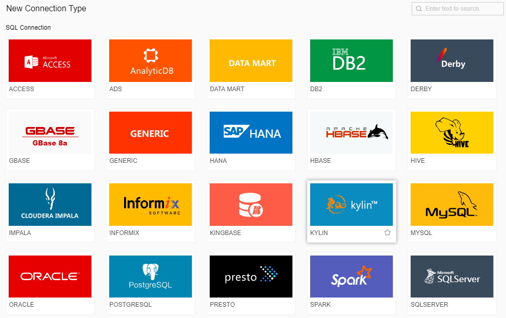 [Select Connection] The database type selected in the homepage is displayed by default. You can also select another database type, here "KYLIN" selected.