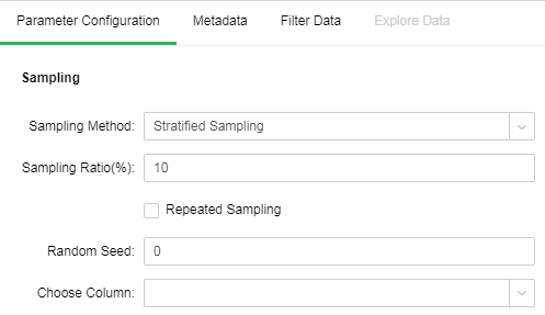 Drag a data set and a sample node to the edit area. Connect the data set and the sampling node. Selected sampling node settings and display area includes four tab pages, namely "Parameter Configuration", "Metadata", "Filter Data", and "Explore Data."