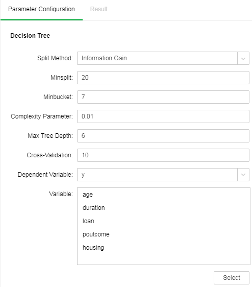 Add a decision tree node, connect the data partition; configuration parameters as shown below:
