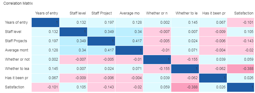 Click "Result." The correlation coefficient between Whether to leave and satisfaction is -0.388, the correlation coefficient between Staff level and Staff Projects is 0.349, and the correlation coefficient between Staff Projects and average monthly working hours is 0.417, which are all within the range of low correlation.
