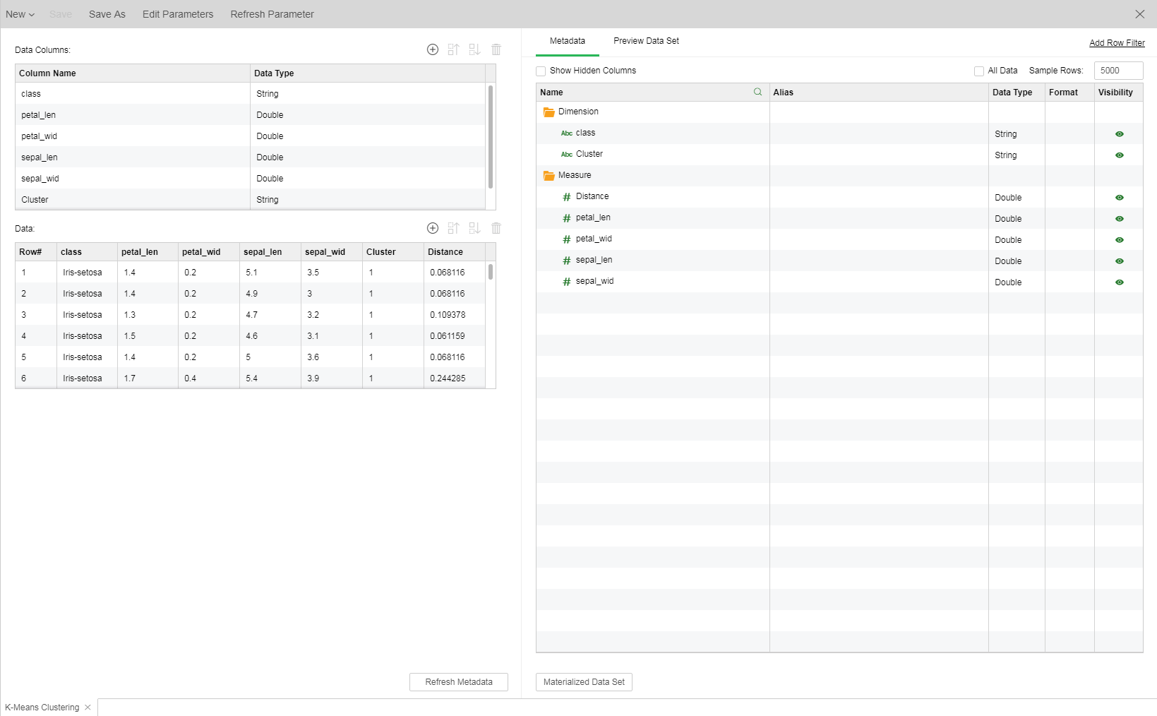 [Save as Data Set] Data of the "K-Means Clustering", "Time Series Analysis", "Score" and "R Data" nodes can be saved as a data set. Data of at most 100,000 lines can be saved as an embedded data set, and data of more than 100,000 lines cannot be saved as an embedded data set. The saved data set can be viewed in the create data set module. Click here to see an example of "Save as Data Set ."