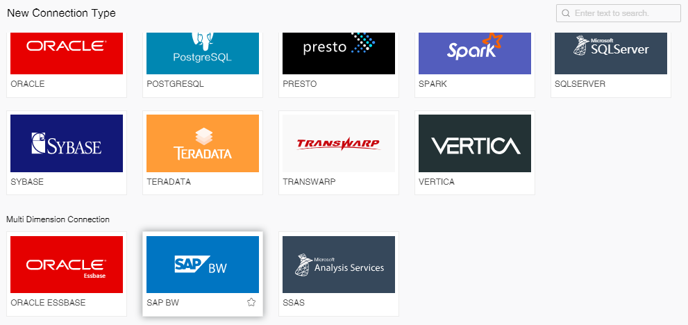 [Select Connection] The database type selected in the homepage is displayed by default. You can also select another database type, here "SAP BW" selected.