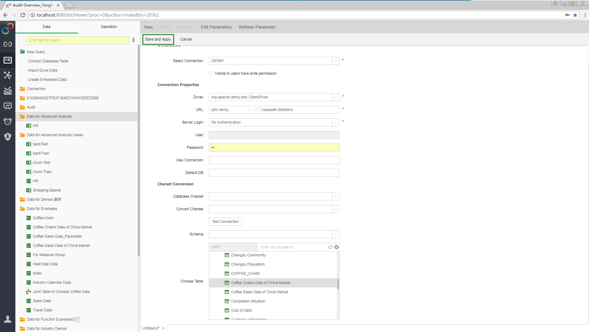 3)Right-click in the table area to refresh the table. Go to Choose Table->APP->Tables->Coffee Orders Data of China Market. Click [Save and Apply], and the table appears in the editing area of self-service data set.