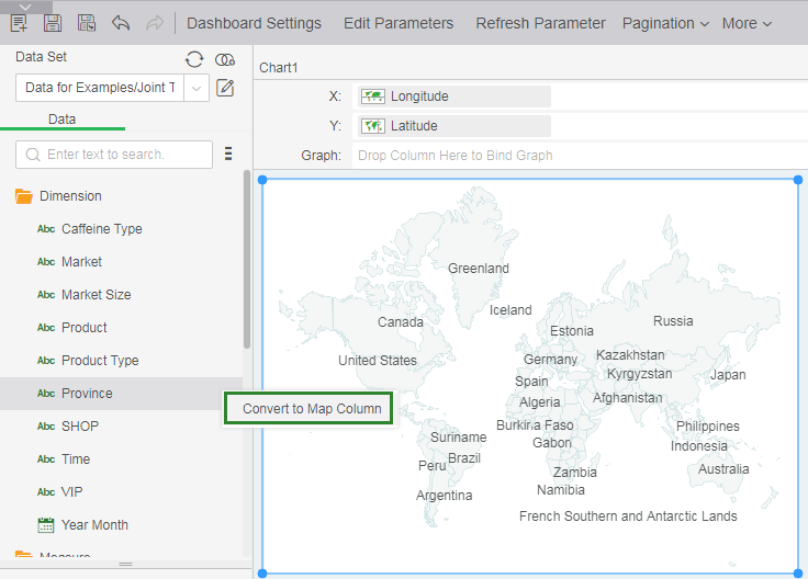 In the left data list, select the dimension "Province" and in the "More" menu, select "Convert to Map Column".