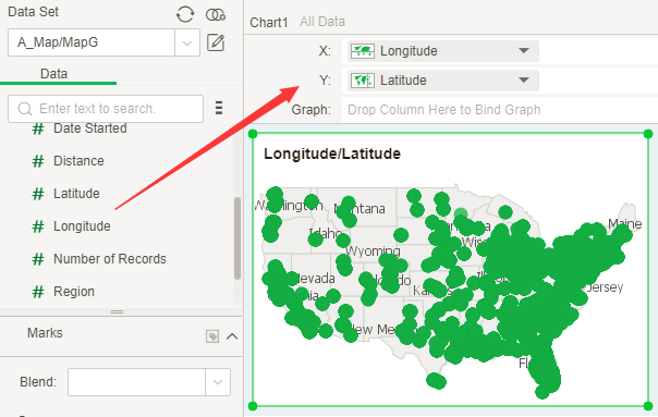 Latitude and longitude data types are point data. You can select the rendering methods from the drop-down list of the bound measure field: point rendering, migration rendering, or heat rendering.