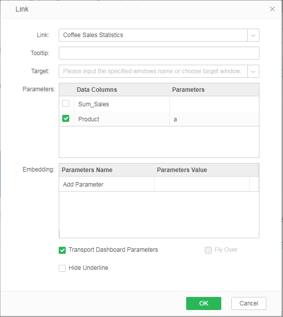 2)2) Set the hyperlink information. Link to the dashboard "Coffee Sales Statistics", and pass the "Product" value to the dashboard "Coffee Sales Statistics".