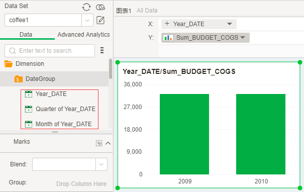 1. As shown in the figure below, create a chart, binding hierarchy field years.