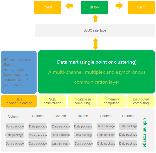 Yonghong Z-Data Mart is a data mart product integrating data storage and processing that is researched and developed by its own technology. Targeting at different scale of demand data that need to be proceed by the user, the different IT system structure and storage system, two solutions are provided for the customer to choose: one is local mode, and the other is MPP mode. When the scale of data that requires processing is under TB, or the ordinary storage structure is adopted, or the personal computer has met the performance demand, we suggest the user to choose the local mode. While facing the Heterogeneous Database storage system, the data scale that requires processing is on TB, PB and beyond, or the IT system and storage system adopt distributed mode, or only MPP mode can meet the performance demand, the parallel processing mode based on distributed structure will better fulfill the customer's demands.