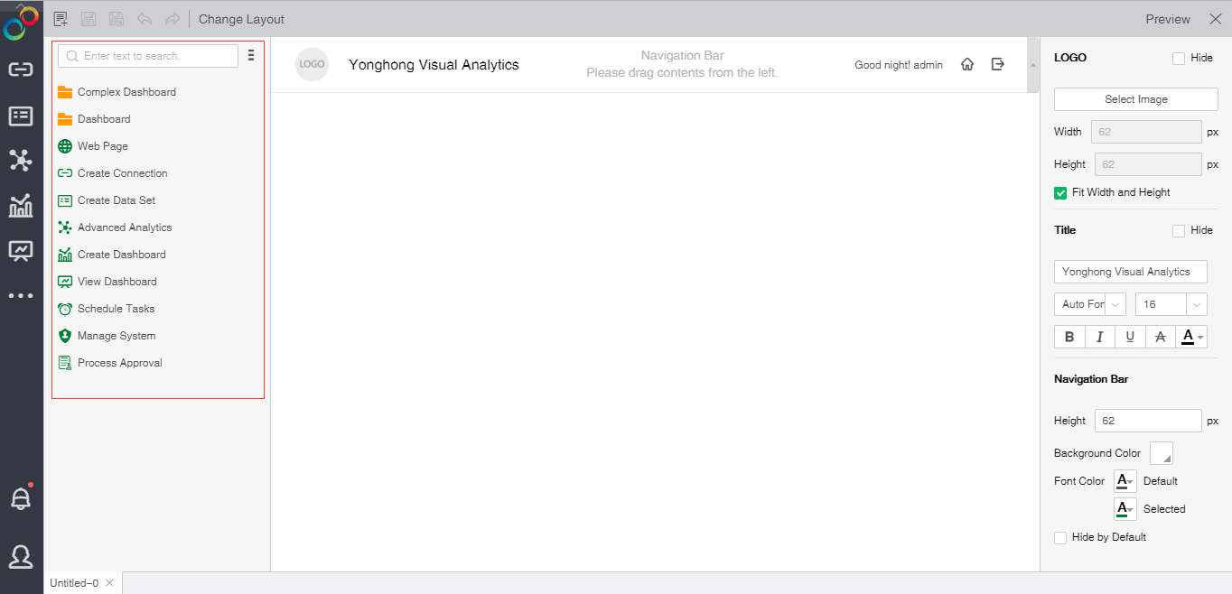 5. Click “Portal Style” (up and down layout, integrated layout) to enter the portal production page, you can drag and drop resources from the resource tree on the left to the portal. The "Portal Component" is stored under the "Combined Report" file, and the produced report is stored under the "Report" folder.