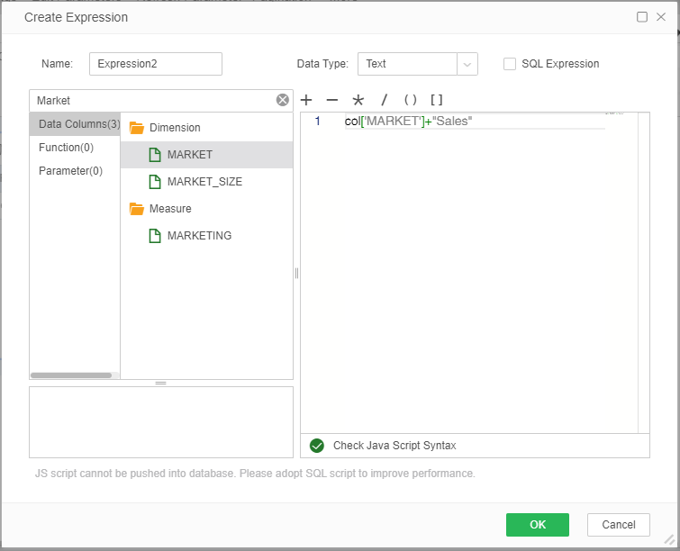 Suppose there is a dimension data segment market "MARKET". When the user needs to add the suffix "sales situation" to each market, it can be realized by the calculator of the expression, just click the corresponding column, such as: "MARKET" and then Then add "+ sales situation" as shown below.