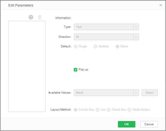 6) Set how to select the parameter value. You can select a parameter value in the form of a selection box, a check box, a radio box, or a list. For example, select "List" as shown below.