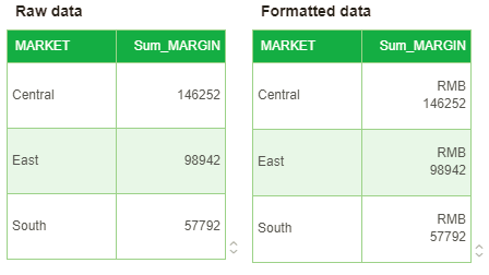 Also supports "\n" for line breaks in text, for example, enter {0,number, RMB\n} in the text, The original data and the format of the data display are shown in the figure: