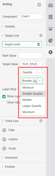 •Special Functions: Quartile, after the selected quartile, there is a drop-down menu to the right, you can choose the value you want to output: Minimum, Smaller Quartile, Median, Larger Quartile, Maximum. The default is: smaller quartile, as shown below: