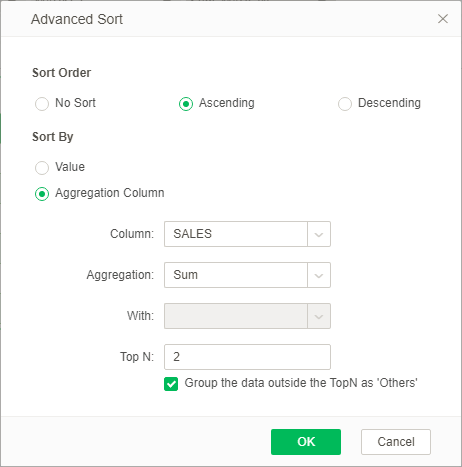 2. In the data segment PRODUCT drop-down list, select Advanced Sort, in the Advanced Sorting dialog, select Ascending, Aggregate column select “SALES”, Aggregate function select “Sum”, Top N is set to 2, check “Data outside of TopN Show as 'Other' ".