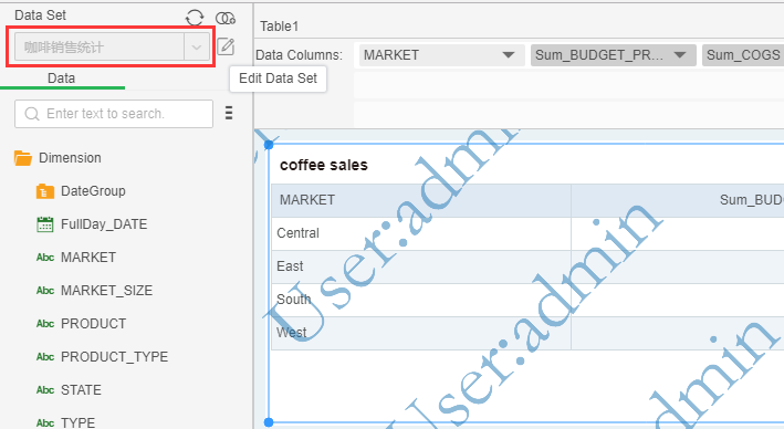 1.Create a new dashboard, specify a data set “Coffee Sales Statistics” and save it as “Test”.