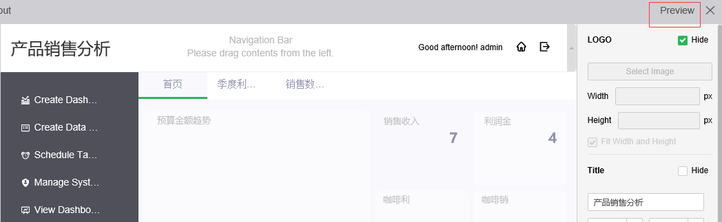 After clicking the preview button, the portal page will be opened in a new browser window. The preview page has the same effect as the actual display portal page, and the component operations of the dashboard can be performed on the preview page.