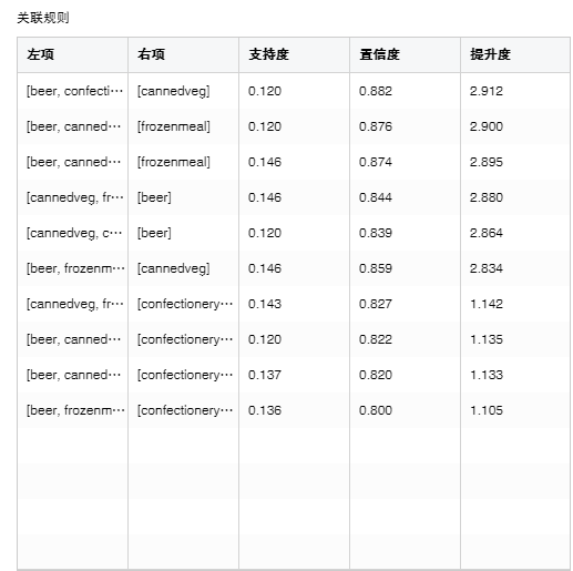 以表中第一条数据为例,bear(啤酒)和frozenmeal(冻肉)是左项,cannedveg(罐装蔬菜)是右项。支持度(Support)表示购买左项的记录数占所有的购买记录数的百分比,置信度(Confidence)表示同时购买左项和右项的记录数占购买右项记录数的百分比,提升度(Lift)表示置信度与已知右项的百分比的比值,提升度大于 1 的规则才是有意义的。
