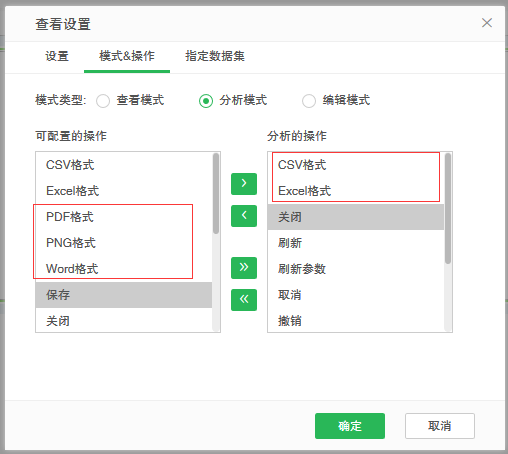 在编辑报告最上方工具栏,更多-查看设置-“模式&操作”,模式类型:分析模式、查看模式、编辑模式。