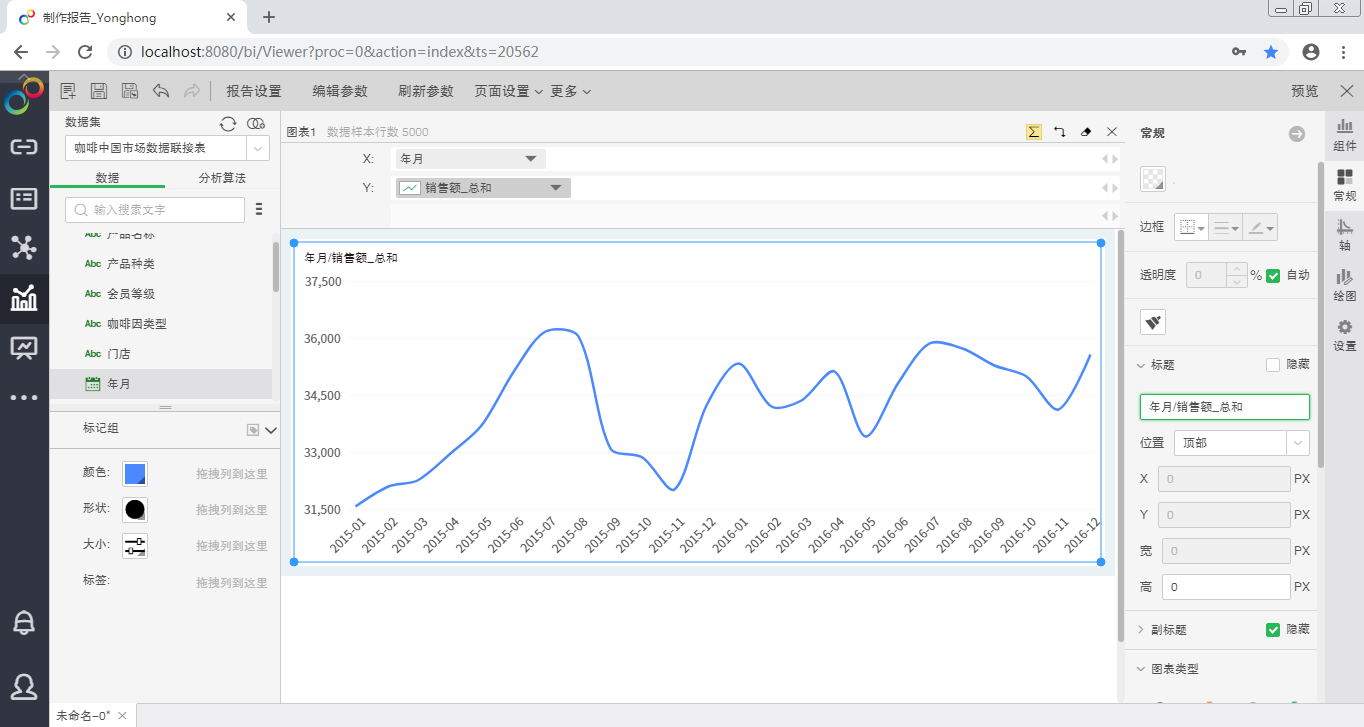 从左侧数据列表中,拖拽维度“年月”到图表组件X轴,拖拽度量“销售额”到图表组件Y轴,得到趋势图。