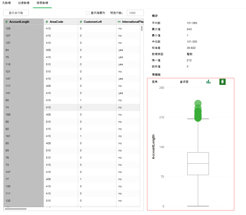 【可视化】可视化区域通过两种图表展示所选列的数据分析结果:直方图展示所选列的数据分布;盒须图展示所选列的数据范围和异常数据分布情况。当选择的是非数据类型的列时,不画图表。
