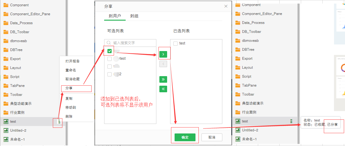 1.打开单个报表的分享对话框,勾选需要分享的用户/组,点击添加图标,点击确定后分享。分享后对话框中的用户和组的已选列表将保持记录,以便撤回。