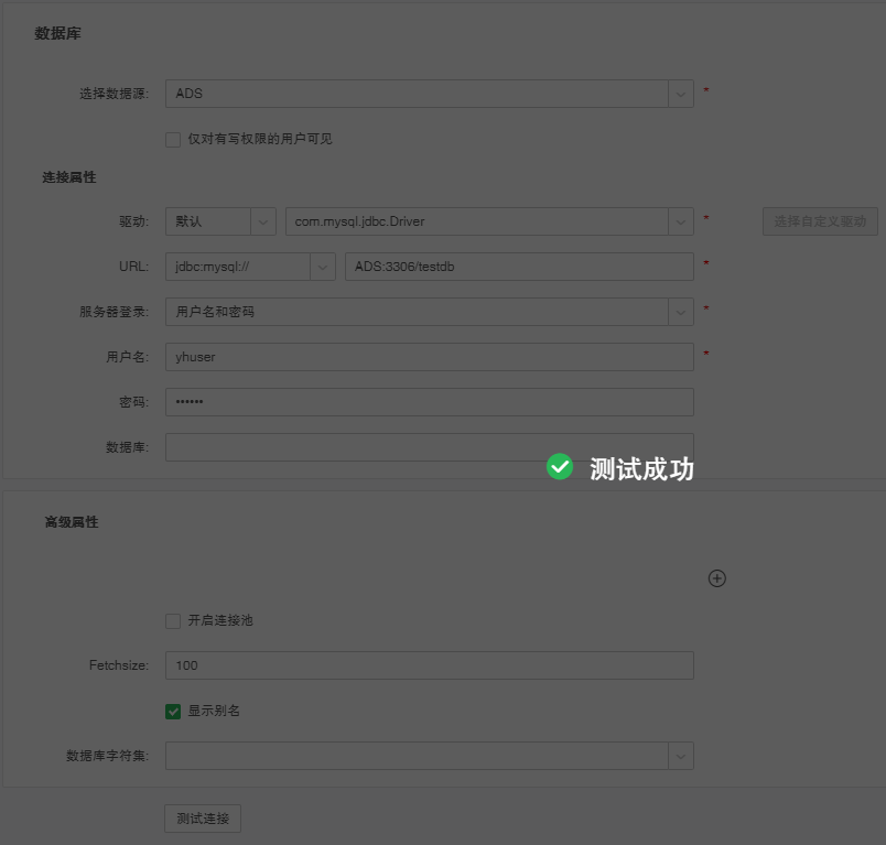 3.点击测试连接,提示测试成功,即该数据源成功连接到相应数据库。
