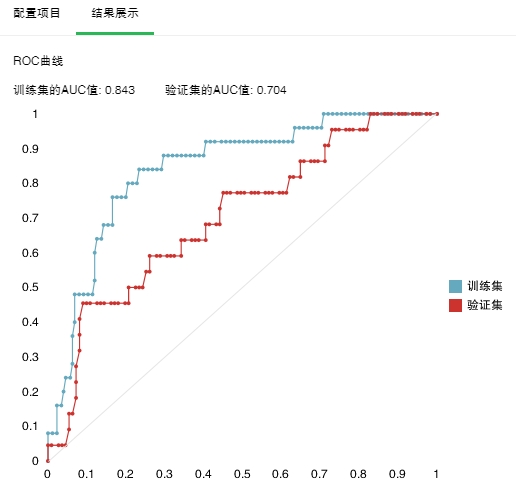 通过ROC曲线看出训练集AUC值0.843;验证集AUC值0.704。AUC值越大模型分类效果越好。