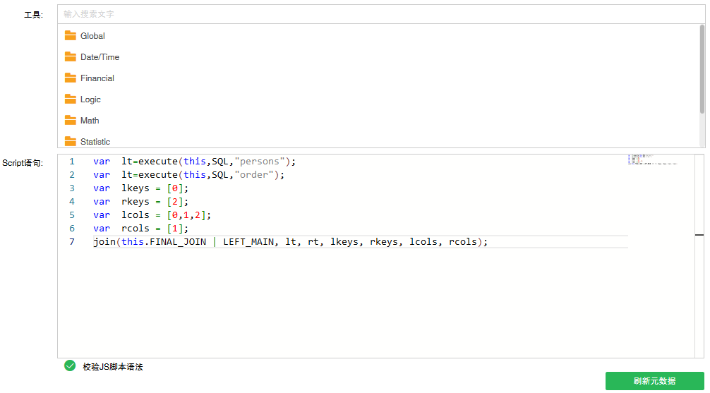 在打开的界面中,用户可编写脚本语句,来实现数据集的连接。脚本查询语句请参考脚本->Script数据集章节。