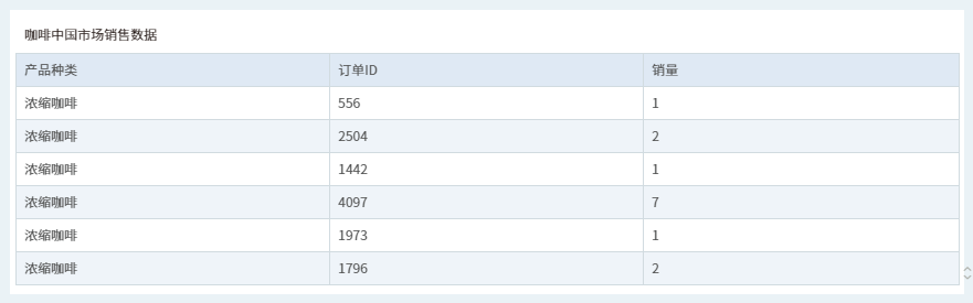 1.新建填报参数组件,绑定“咖啡中国市场销售数据”数据集中的“订单ID”列、“产品种类”列、“销量”列,如下图所示。