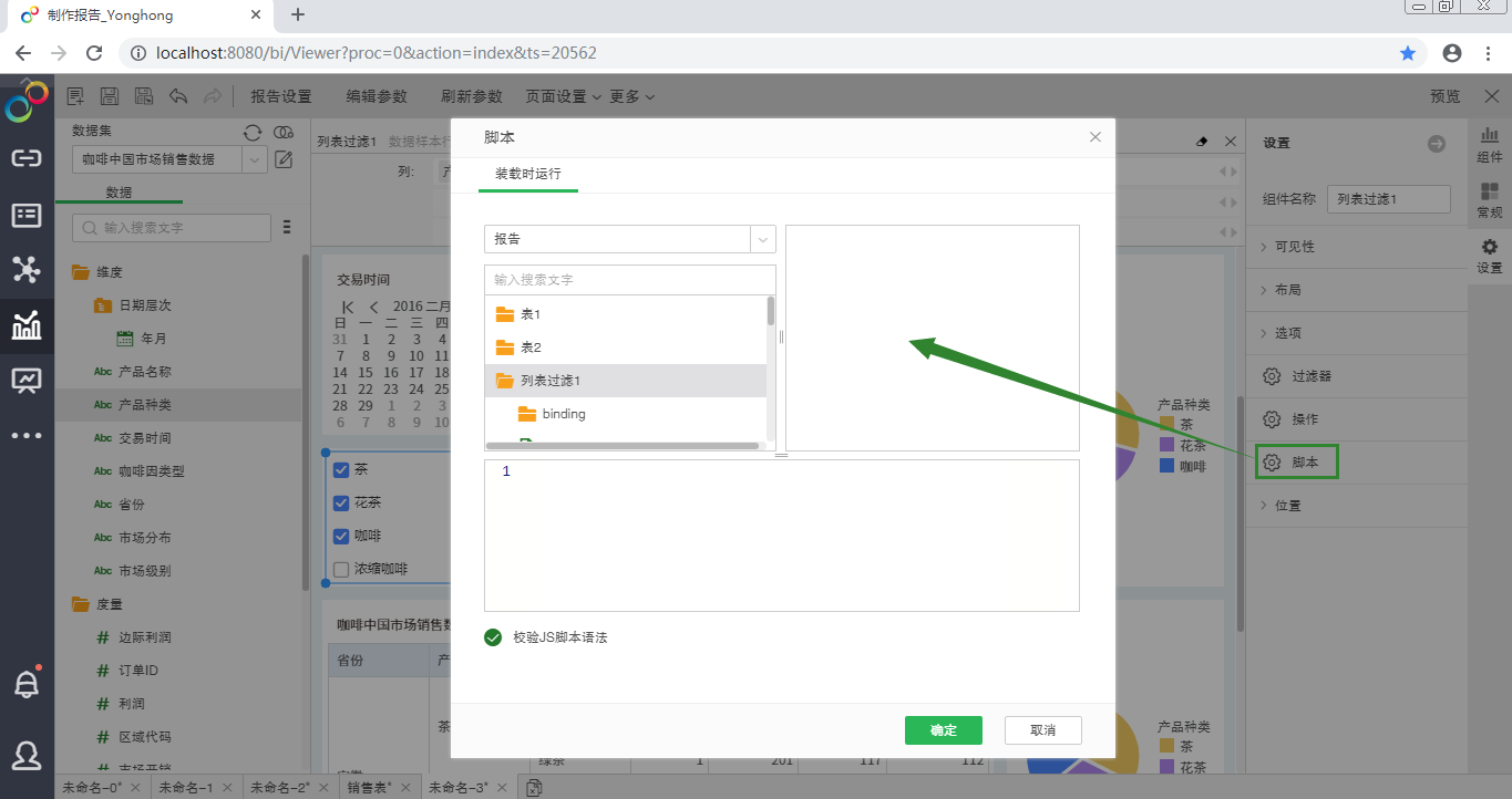 1.选中报告中的过滤组件,在右侧【设置】>【脚本】中,打开脚本窗口。
