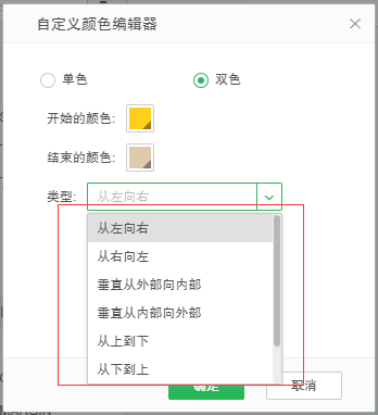 当选择单色时,用户可以设置颜色和渐变类型,渐变类型默认选中“从左向右”,用户可根据需要进行选择。