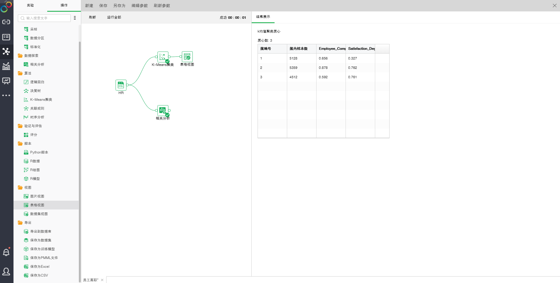 表格视图节点连接算法节点(相关分析除外),设置及展示区包含:结果展示。