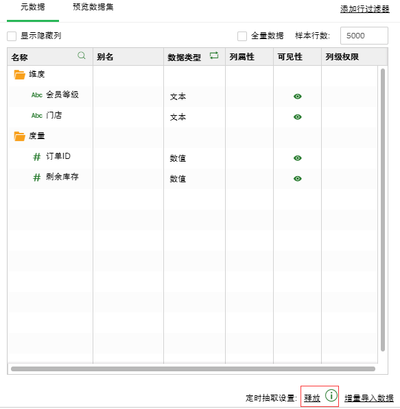 当用户需要释放掉已经同步的数据集时,在数据集的元数据区,点击 “ 释放 ”,即可释放掉已同步的数据集。释放后图标也不会消失,只有删除相关的定时任务图标才会消失。