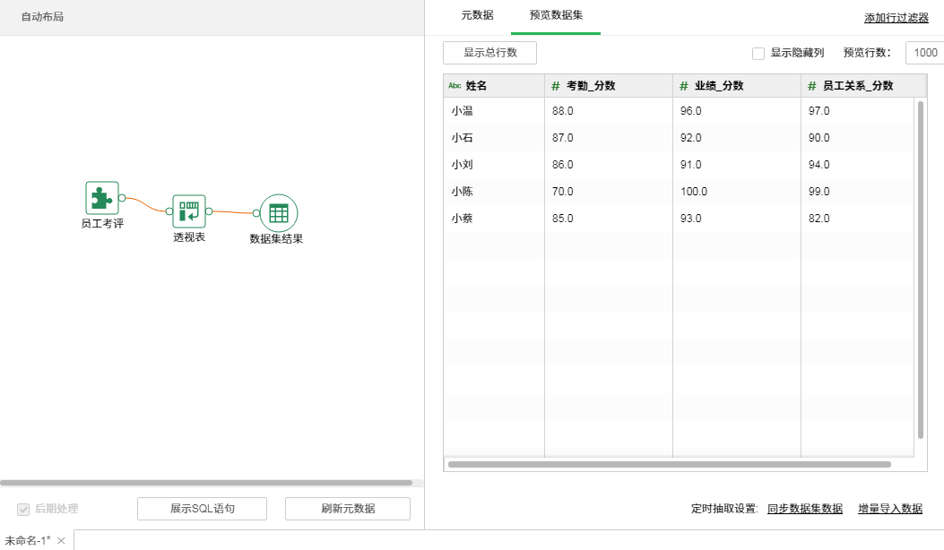 自服务数据集支持了行转列功能,即透视表功能。只需选择需要转换的字段,就可以轻松将行转换为列,实现一维表二维表的切换。