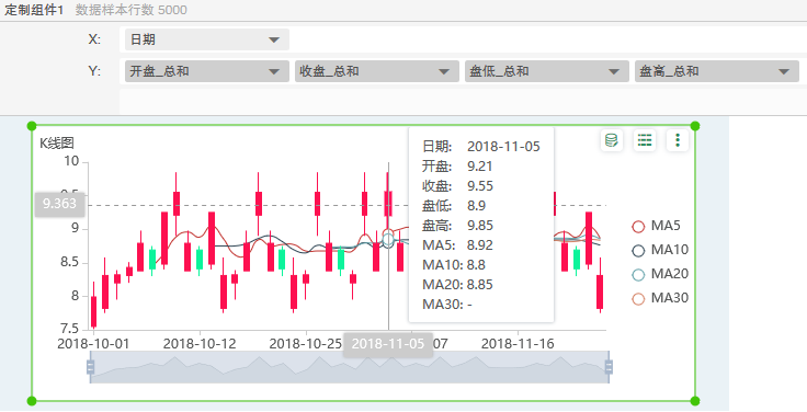 创建K线图,可以在右侧pane的组件中拖动K线图组件到报告编辑区域,按照绑定区域的提示绑定对应的数据,如下图所示,其中,MA5、MA10等分别表示5日和10日移动平均线。