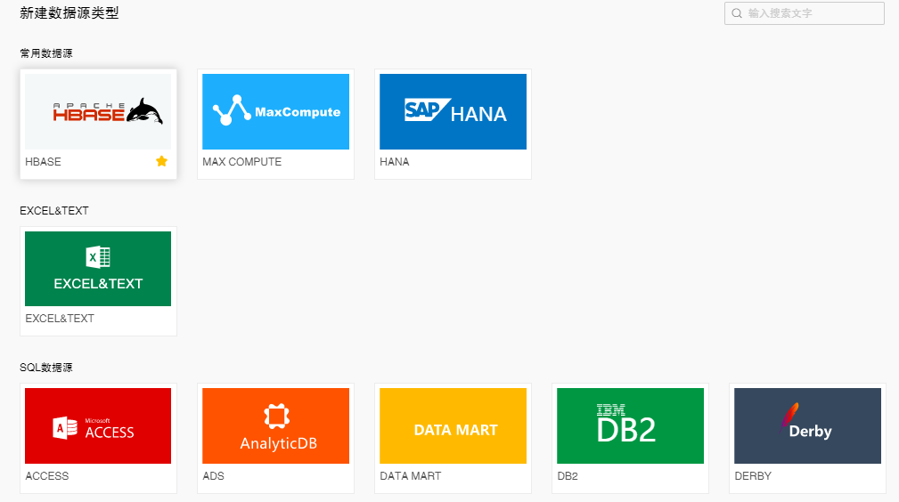 数据源首页展示了各种数据源,点击数据源图标上的星号标识,可以将标记的数据库添加到常用数据源里。依次点击DB2,DERBY,HIVE,HBASE,数据源首页会添加三个常用数据源,点击常用数据源里数据源图标上的星号标识取消收藏。