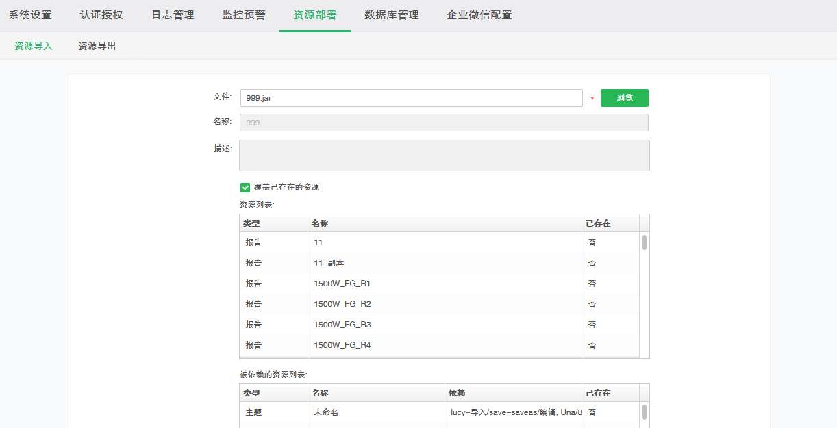 【覆盖已存在的资源】当勾选此项时,倘若本系统存在与 jar 文件包含同名的报告、数据源、数据集、实验、训练模型、组合报告、门户、调度任务、主题和表格样式时,覆盖系统中原有的资源。
