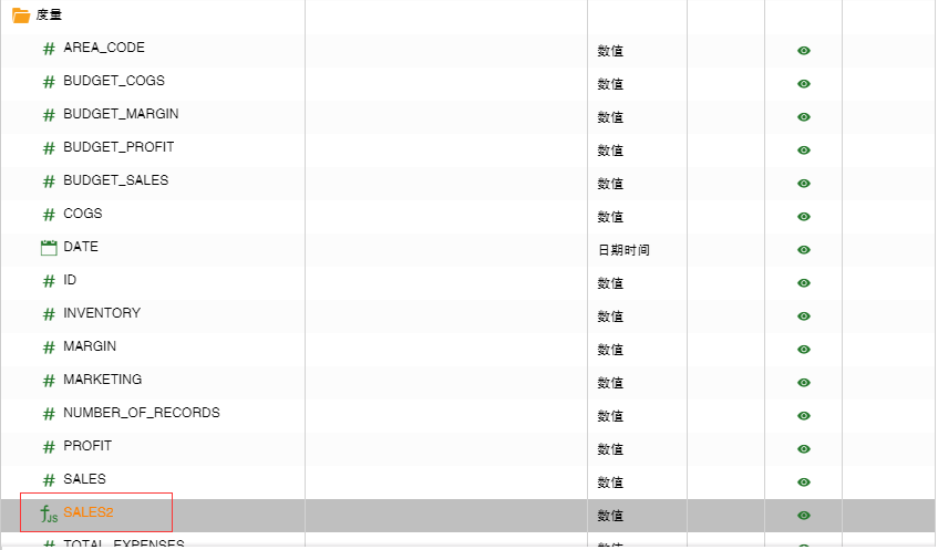 则在度量节点下生成 SALES2 字段,如下图所示。